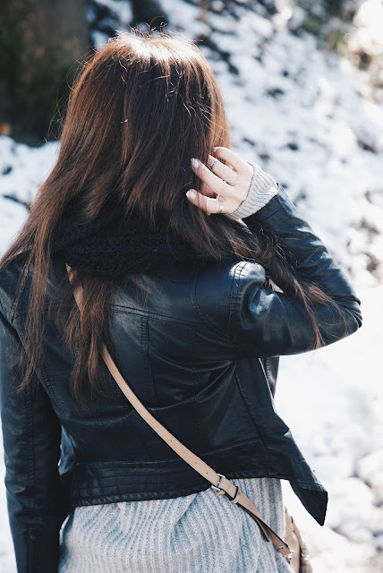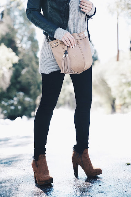 Outfit Details: Sweater: Banan Republic - Jacket: Forever 21 - Jeans: H&M - Purse: Guess - Booties: Target.